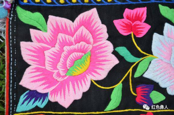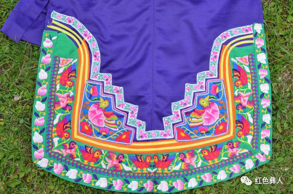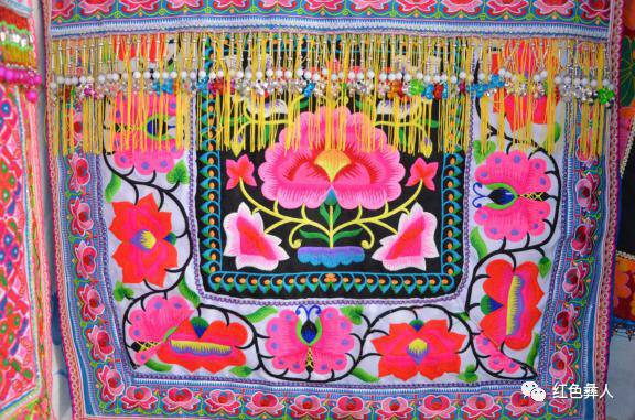 赛装场上,色彩纷呈,满眼都是花花绿绿的鲜艳服饰,令你目不暇接。彝族妇女不光是在帽子、衣服、围腰上绣花,而且还在挎包、鞋子、鞋垫上也绣满了各种图案。并且各人的工艺、构图、用色都互不相同,各有千秋。风雨雷电,日月星辰,山水木石,花鸟禽兽,各种人物都可以入绣。其构图上的繁简虚实,形象的夸张变形,色调上的对比反差,令人叹为观止。