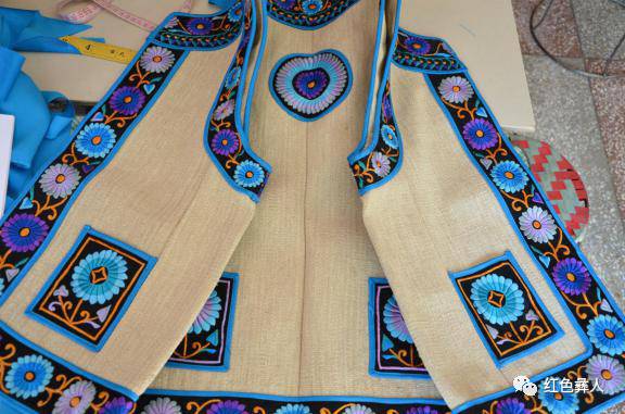 蓝— — 也是彝族服饰中最常用的颜色,与黑色相同,多作为底布。上衣和裤子都常用蓝色,但与黑色交错使用。或上黑下蓝、或上蓝下黑,很少整身都穿蓝色。做底布的颜色一般称为阴丹蓝,有些较深偏于青、近于黑,作为上衣和装饰布条的颜色多倾向于湖蓝色。