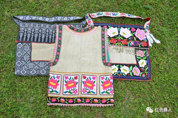 白色— — 多作为底布,上绣图案装饰于胸前、袖口、围腰上和裤脚边。山区服饰中的一般面积使用不大,河谷、南华一带的罗罗支系也用来做衣裤的基布。彝族人还常在白色的底布上,绣上图案做一个精美的挎包。