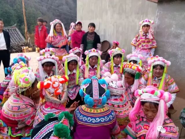 报过信礼不久,结婚的大喜之日很快就到了。这一天,隔山隔箐的南方家和女方家度喜气盈门,大清早,相约而来的亲戚、朋友就都到了,有哦帮杀猪,有的帮宰羊。有的送来了办宴席待客的锅碗瓢盆,有的则从附件山坡上彩来大抱的树枝,爬高上低,开始搭青棚。搭青棚对彝族特别是红彝人来言,是婚礼的一项必不可少的内容。在华夏众多的民族中,婚礼离不开青棚,大概也是绝无仅有的。红彝人搭青棚,有悠久的历史。婚礼中的青棚要搭成什么样,尺寸多大,甚至用什么树的树枝来搭,都是有严格的规矩的。青棚搭在场院里,要分开搭,搭成两处,一处用来摆放婚席,另一处用来搭灶做饭,红彝人把做饭的这个青棚,叫做厨青棚。除了青棚,烘托气氛的牌坊也是必不可少的。牌坊当然也和青棚一样,是用青青的松枝搭成的,装点牌坊的,有色彩缤纷的彩纸,还有鲜艳夺目的大红灯笼,牌坊的两侧十分醒目的陪着一付庆祝信任结成佳偶的对联。在屋厦的前面,要对应地栽起几棵木杆,并就这立杆的山断,横搭几根杆子,凌空把一些香叶树枝在横杆上铺过去,直至厦檐,为了使屋里和场院散发透人的香气,红彝人还兴把柏树枝和香树枝插在大门和堂屋门的两侧。