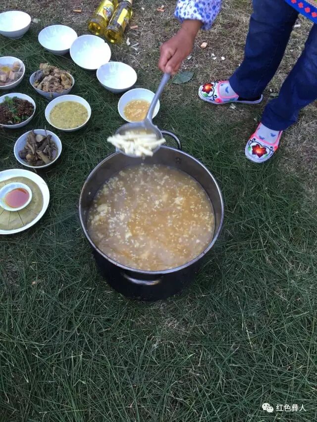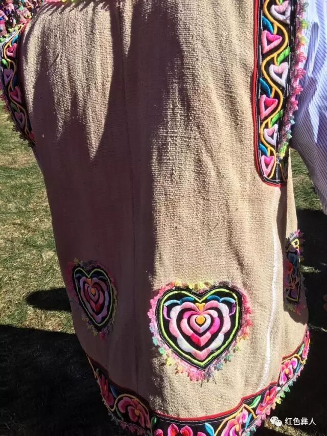 上了山我们就到了景色迷人,山清水秀的峨山鹰岗岭草坡岭举办地了。热情好客的彝族阿表哥,阿表弟们穿着彝家勤劳的巧媳妇、巧彝妹们通过繁琐的程序织出来的盛装,其中火草马褂采用天然生态工艺制作,有钱都难买到,说到彝族手工传统工艺,就不得不说火草。 火草,彝语称"蹈摸",顾名思义,造火用的草,是彝族服饰在制作加工过程中的传统材料。火草属野生草本植物,每年立秋前后开始采摘火草,将撕下来的火草薄膜经过水煮,纺成线,织成布,缝制成女式披肩和男式马褂,由于火草能燃火,火草布也就显得尤为珍贵,无论是火草衣还是火草披布都要传承两、三代人,大多彝家人都把火草布当作传家宝。因此,火草绣花披布、火草绣花马褂、火草绣饰品也成为了彝族人家最上乘的装饰品和馈赠。漂亮的彝家阿表姐和阿表妹们也穿着一身艳丽似火的盛装,其中后披也是火草做的,一身下来最少也起码值一两万,光帽子上的装饰品价值不斐,中老年戴的包头也有着悠久的历史了,还有银链子戴上去装饰好漂亮的。不说了敬酒歌唱起来了峨山彝家小锅酒端起敬过来了,我第一次听到这原汁原味的本民族酒歌,听得专心致志的时候酒敬过来,热情的酒歌让人盛情难却,一激动妹妹要开车把她的也两杯并一杯一口干了,哇好爽,口感至今难以忘怀,彝家兄弟姐妹们热情的款待,让我们一起兴高采烈的边吃边聊。