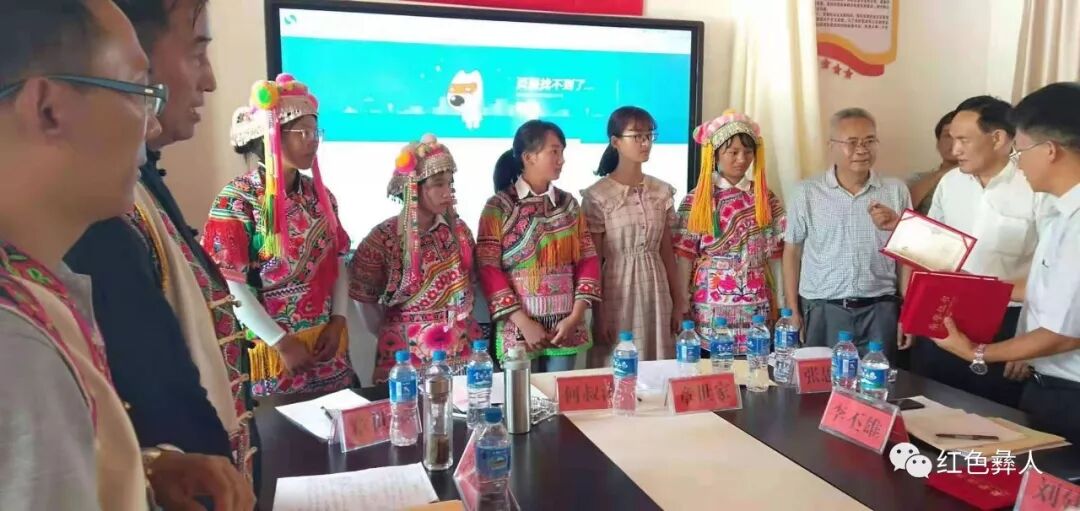 会上,全体与会研究员讨论修订并通过了《云南民族大学乃苏颇研究中心“红彝优秀大学生奋进奖学金”管理办法》(2019年修订),随后举行了2019年红彝优秀大学生奋进奖学金颁奖仪式。在2019年的各类升学考试中,共有8位乃苏学子脱颖而出,获得奖学金。其中,禄丰县李婧菲同学考取中南财经政法大学研究生;武定县猫街镇杨颖洁同学以693的高分被“双一流”学校浙江大学录取;武定县猫街镇毕洪志以628分被西南交通大学录取;李成凤、李云慧、佘金敏、章淑丽、何晓莲等6位女同学被二本及以上院校录取。研究中心主任、副主任等领导为获奖学生颁发证书并合影留念。19年获奖代表李婧菲、李云慧和18年考生获奖代表陆翠丽等3位同学分别做了主题发言,分享各自的成长经验和未来展望。李成龙老师作为彝族乃苏优秀儿女励志毕业生代表,分享了自己如何以巨大的毅力克服重重困难,最终取得成功的学习和工作经历。李晓丽、潘建宏两位女士分享了她们成功创业的经验。县级非遗传承人、乃苏绣女张有芳向大家展示了她的精美绣品,详细介绍了刺绣的技艺,图案的寓意和色彩搭配,分享了她做刺绣品开服装店的所思所感,表达出自己对彝绣事业的热爱。农村致富能手代表张思维介绍了他种植中草药致富的经验和未来农村产业发展规划。这些来自各行各业的优秀代表竞相登台,分享经验和收获,获得了与会代表的热烈掌声。