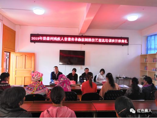 参加上午培训班开班仪式有州残联王玉红主任,县残联张学晖副理事长,镇人民政府许建波镇长。开班仪式上镇人民政府许建波镇长作开班动员讲话,他向学员们提出:一要发挥猫街彝绣产品的特色,提高彝绣产品的档次和品质上下功夫,以就地就业的方式,发展订单式彝绣产品经营模式,促进残疾人增收脱贫;二要在彝绣产品市场营销上,推动“互联网+”以扩大销售市场,以彝绣产业助脱贫;三要学员要勤思考、多观察,多交流、善沟通,努力学到真本领,发扬传统彝绣技艺,将“非遗传承+文化扶贫”模式发挥得越来越好,立足做活合作社,把小产品做成大产业,助推残疾人脱贫致富,实现文化助脱贫。