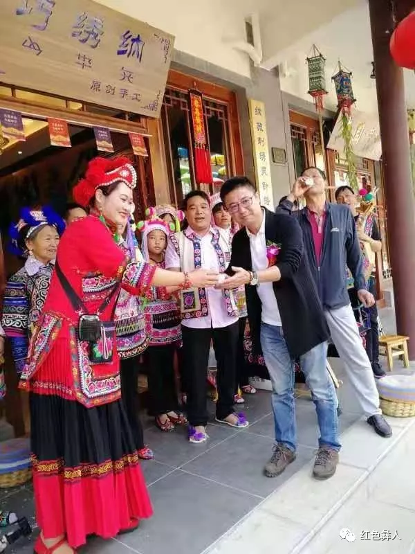 2019年9月28日是个重要的日子,这天彝绣“巧绣纳”新店在禄丰县城金山古镇顺利开业了,这标志着红彝刺绣文化的发展又迈出了重要的一步。开业当天许多亲朋好友自发到店里参观帮忙,组织迎宾,献唱彝族歌曲,传递着浓厚的彝族风情,现场气氛热烈。张有芳经营的彝绣“巧绣纳”是以乃苏(红彝)服饰文化为特色的服装实体店,经营各种类型的绣品,有红彝男子火草马褂、妇女服装、挎包、背布、绣鞋、香袋、挂件、剪袋等。心灵手巧的绣娘们裁出漂亮的纸花做成服饰图案的母版,各类精美绣品都饱含着绣娘们的别出心裁,辛勤汗水,表达出彝族多姿多彩的文化内涵和对彝文化的喜爱。尤其是男女服饰,其花边、颜色、款式,哪怕是一个小小的部件都有特别的彝文化寓意。如中年妇女服饰以深蓝为底色,领口和绣口镶上花边,配上黑白长裙,表现出了彝族妇女的成熟、端庄、稳重。年轻女孩服饰以艳色为主调,配上各色艳丽的花边、图案、挂件饰品展现出了红彝女孩的青春靓丽。男子马褂以火草作为主要材料,简约大方而又不显单调,显露着彝族男子勤劳朴素,热情豪爽的性格。绣品图案中以马缨花、山茶花、七彩神鸟为主,象征着幸福吉祥,飞黄腾达之意,体现了彝族人热爱生活,努力开拓的品质。
